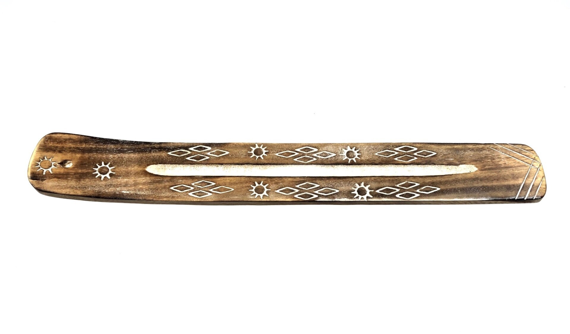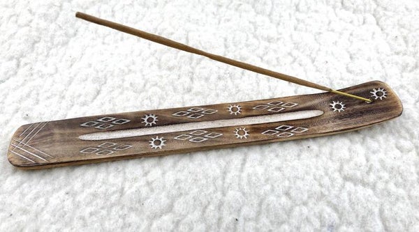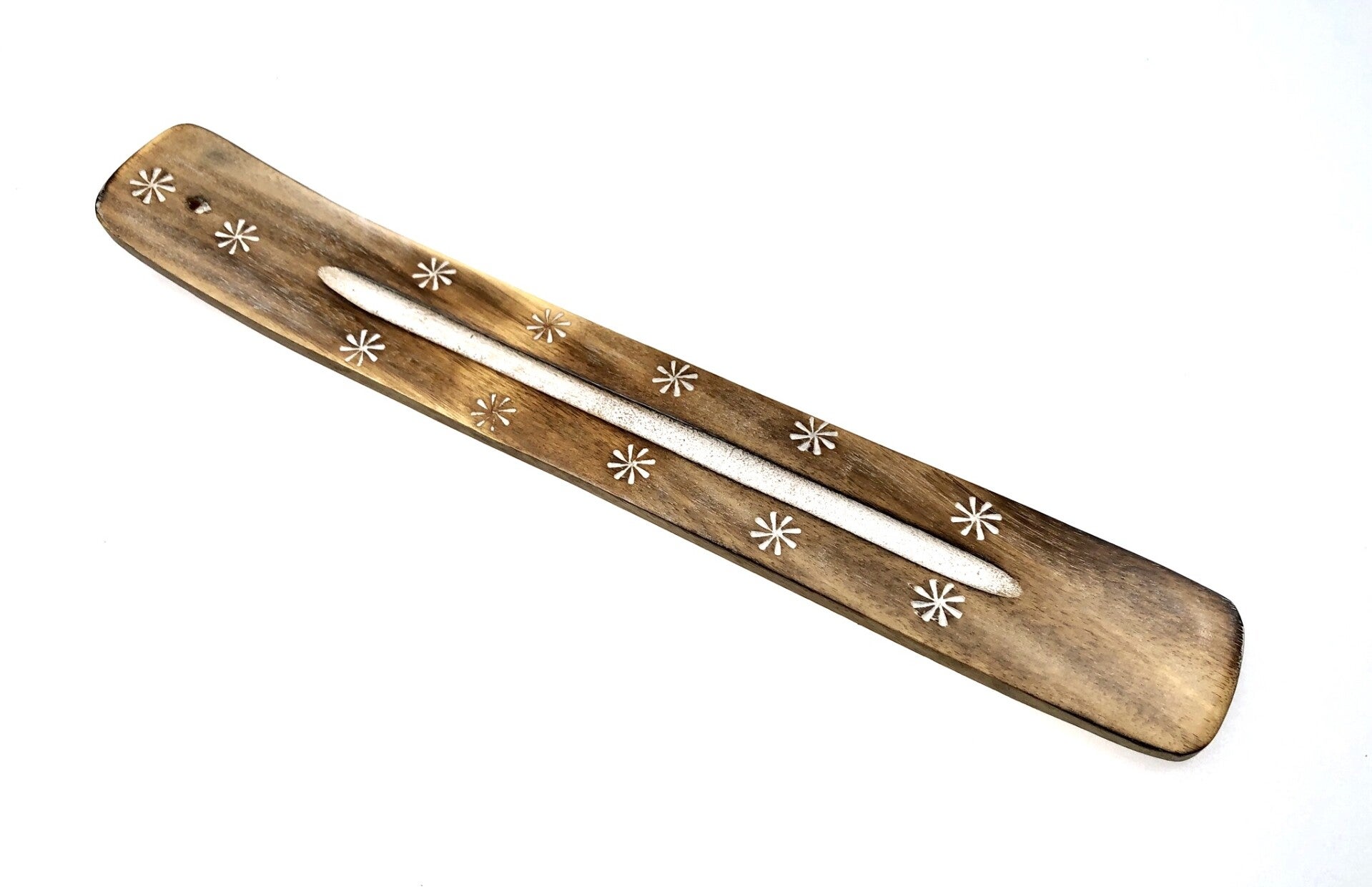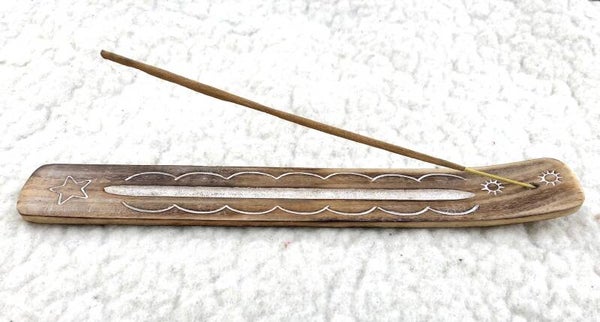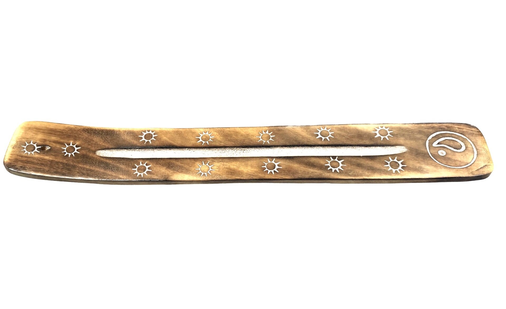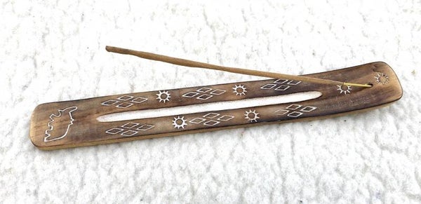 - Het plankje heeft aan de bovenkant in het gebogen stuk een kleine openening om een wierookstokje veilig te kunnen laten branden, de as kan zo opgevangen worden op het plankje.