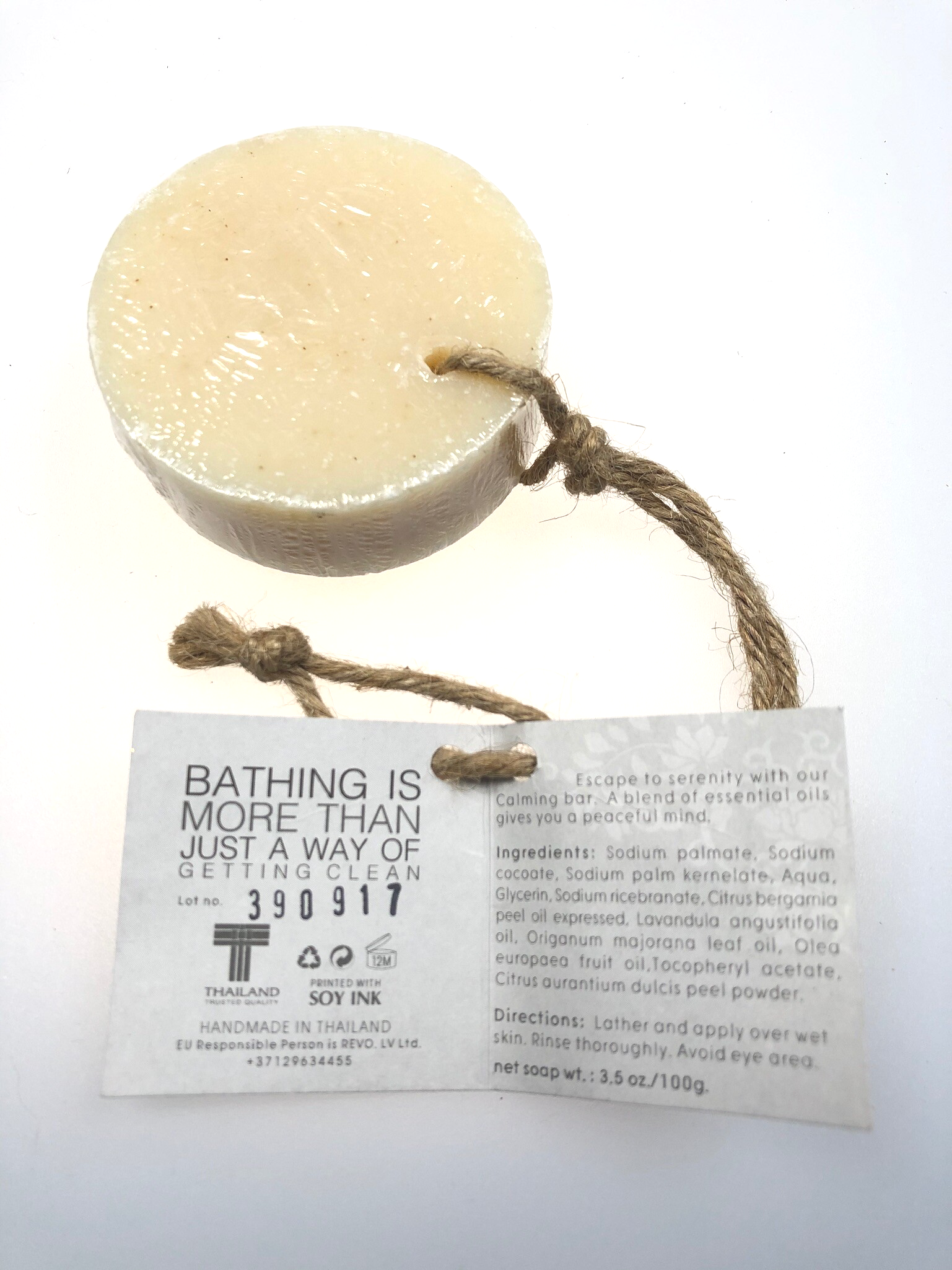 - 100% natuurlijk stuk zeep van 100 gram aan een hennep touw zodat je het a gebruik hangend kunt laten drogen.