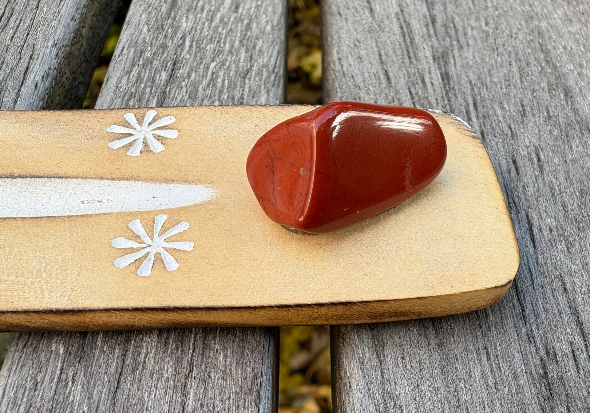 Wierookplankje van mangohout met white wash effect met een rood edelsteentje er op vast, in dit geval een rode Jaspis.