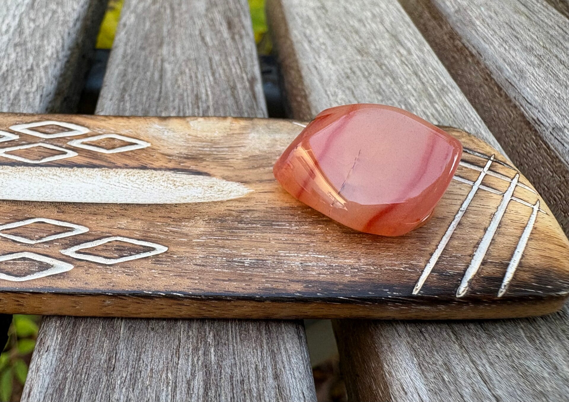 Wierookplankje van mangohout met whitewash effect met daarop vast een trommelsteentje van Abrikoos Agaat.