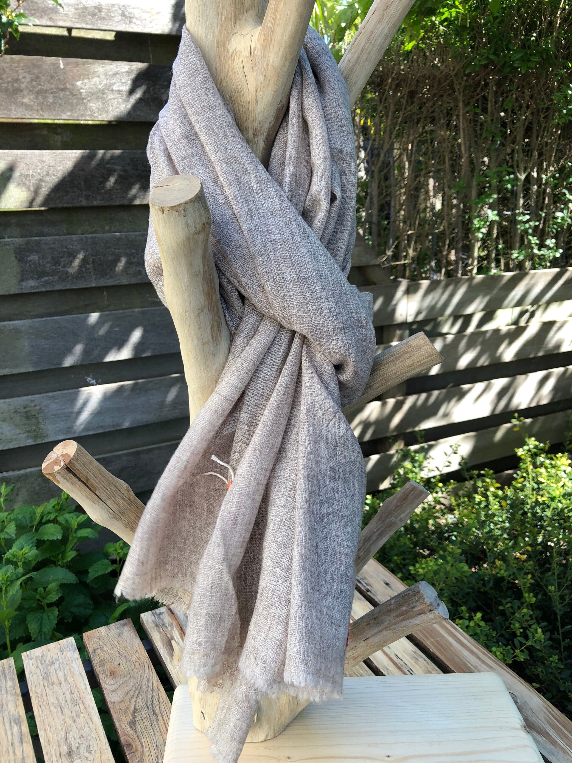 Langwerpige beige wol met acryl sjaal van "Madat", wat hulp betekent in het Nepalees. Deze sjaal draagt heerlijk soepel en irriteert niet. Het is een fair trade product!