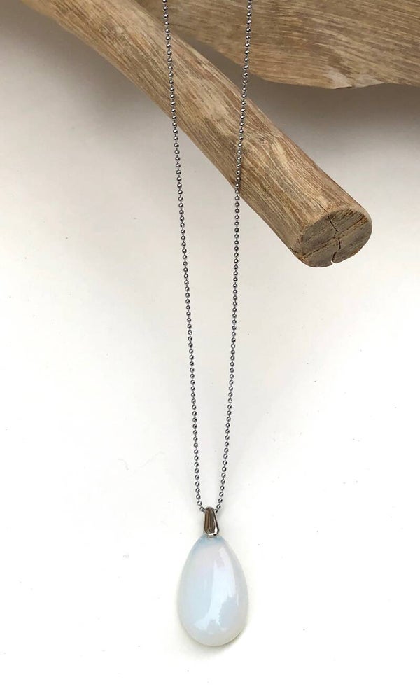 - Opaliet hanger met zilverkleurige bolletjes ketting met sluiting van 45 cm.Opaliet is een "man made stone", maar hij is wel mooi met zijn mysterieuze doorschijnende uitstraling.