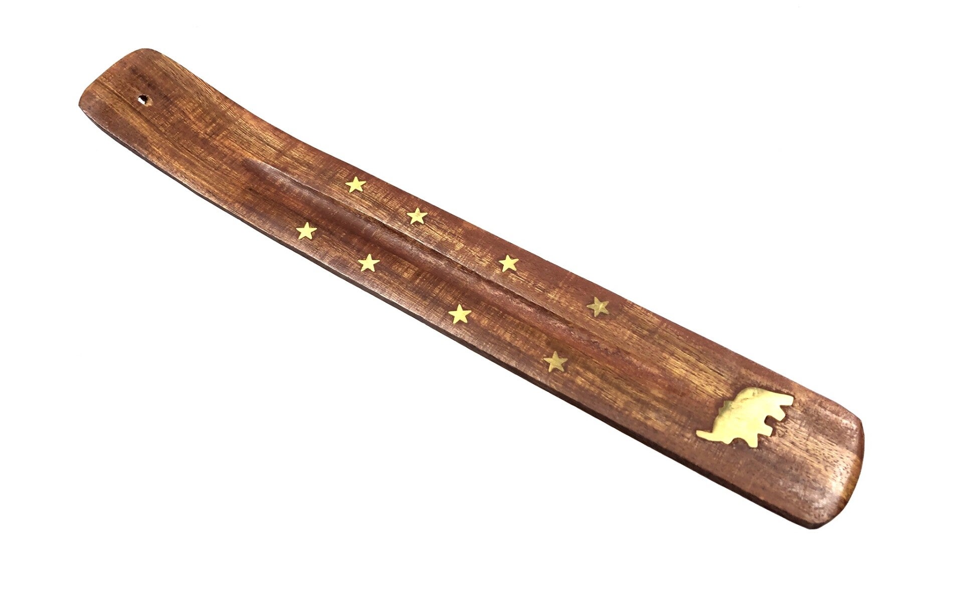 Wierookplankje van donker mangohout met koperkleurige mammoet en sterretjes.