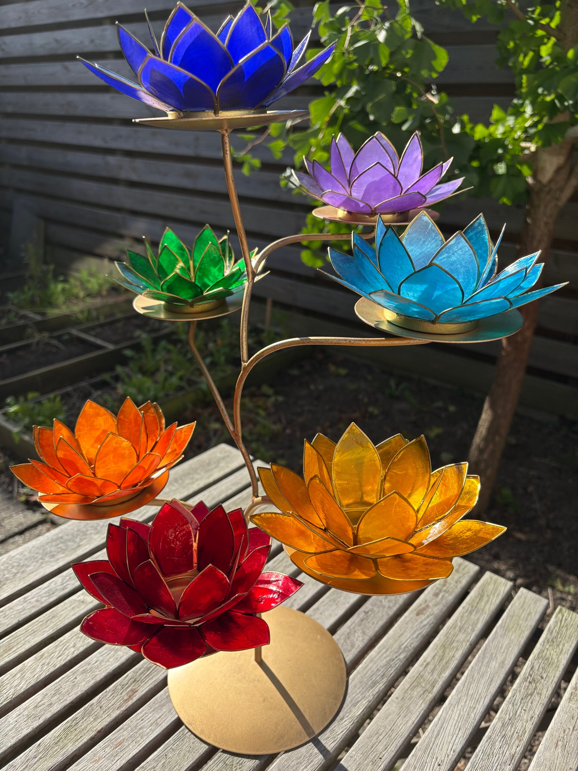 Koperkleurige metalen standaard met zeven lotuslichtjes van Capiz schelp met goudklerand in de bekende chakrakleuren,rood,oranje, geel,groen,blauw,violet en indigo
